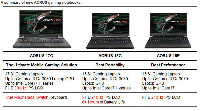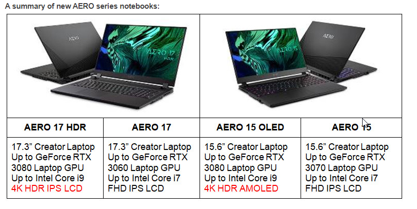 Gigabyte komt met de AERO 17, AERO 17 HDR, AERO 15, and AERO 15 OLED. De laptops zijn dit jaar voorzien van de NVIDIA GeForce RTX 30 Series Laptop GPUs die gebaseerd zijn op de Ampere-architectuur. Performance is drastisch omhoog vergeleken met de laptops van 2020, maar ook de airflow en thermals. Gigabyte claimt 10% betere cooling-prestaties. De laptops zijn dit jaar ook voorzien van een HDMI 2.1-poortje.