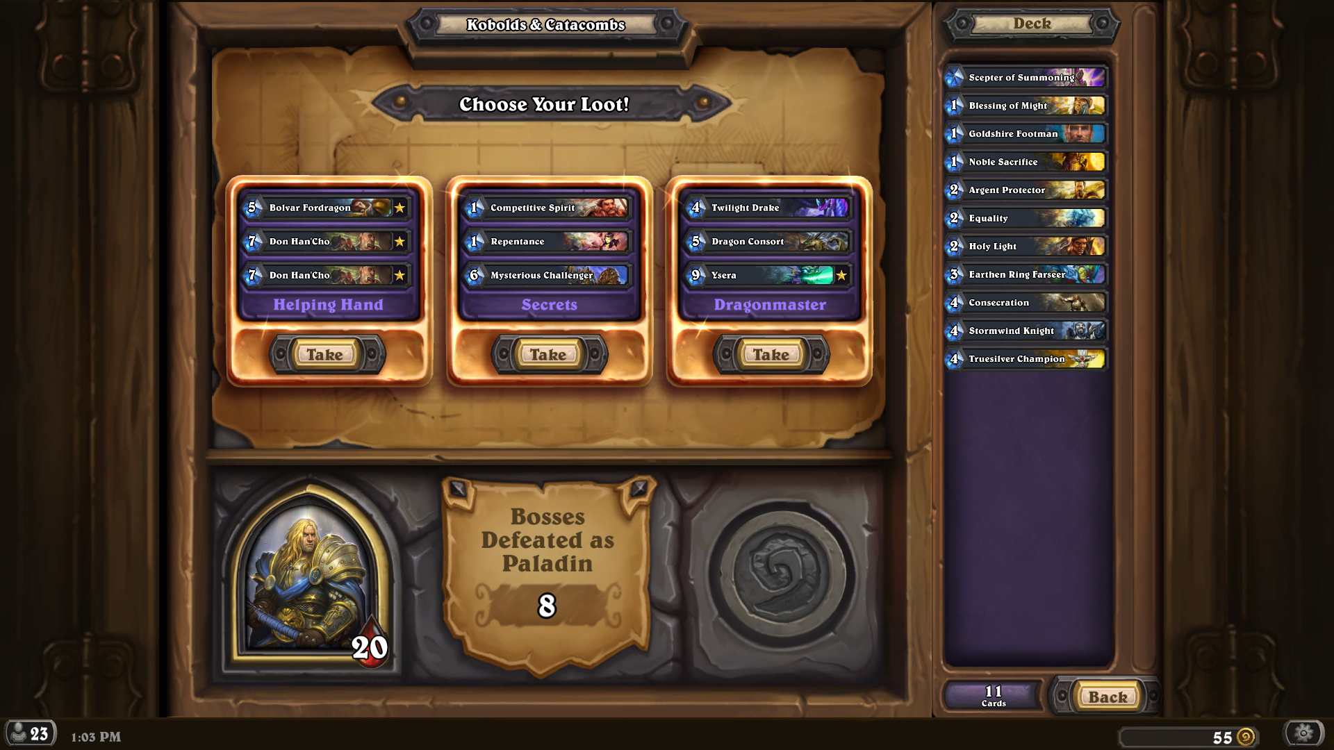 Laten we het nu hebben over de Dungeon Runs, wat ons betreft de beste singleplayer-ervaring van Hearthstone tot nu toe. In de Dungeon Run begin je met 10 kaarten en moet je in totaal acht bazen verslaan. Wanneer je een duel verliest in deze nieuwe modus, moet je weer helemaal vanaf het begin starten. Telkens als je een baas verslaat, krijg je de keuze uit drie opties met drie kaarten. Zo kun je naarmate je vordert in de dungeon je eigen deck bouwen en met je eigen tactiek de bazen verslaan. Soms krijg je ook een tweede keuze waarbij je één van de drie krachtige schatten uit mag kiezen. Deze kaarten zijn zo sterk, dat ze alleen in deze modus gebruikt mogen worden. Zo kan je er bijvoorbeeld voor kiezen dat je minions permanent stealth hebben of dat je twee extra kaarten trekt bij de start van een potje.
