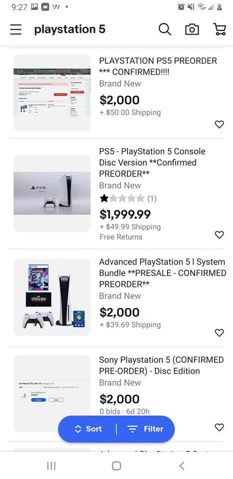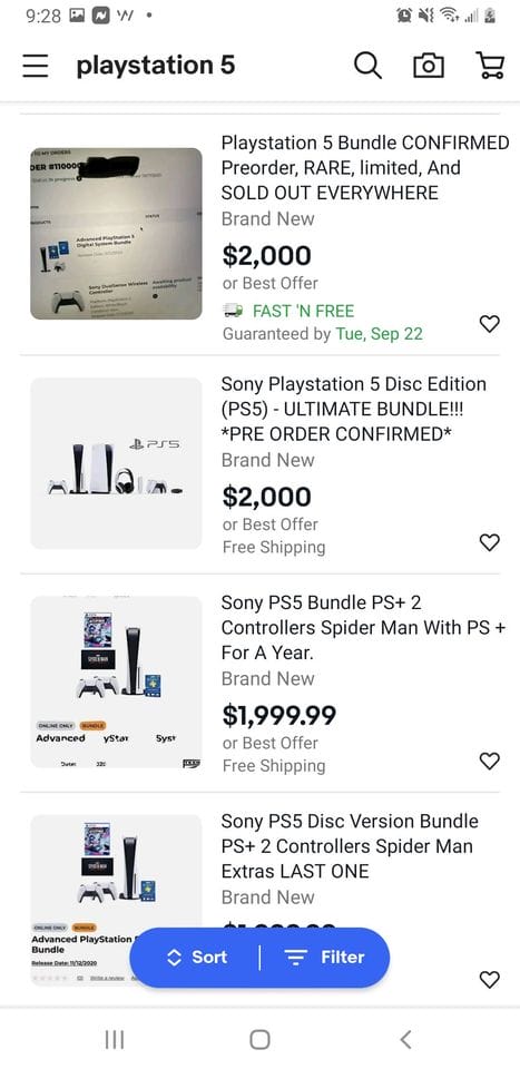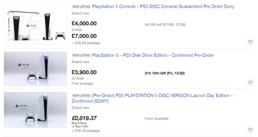 Indien je echter genoeg geld hebt, kan je sowieso wel een PS5 op de kop tikken voor launchdag. Je moet er alleen wel enkele duizenden euro’s voor opzij zetten. Op verschillende tweedehands websites duiken er namelijk gigantisch veel PS5-consoles op van mensen die hun pre-order willen doorverkopen voor heel veel geld.