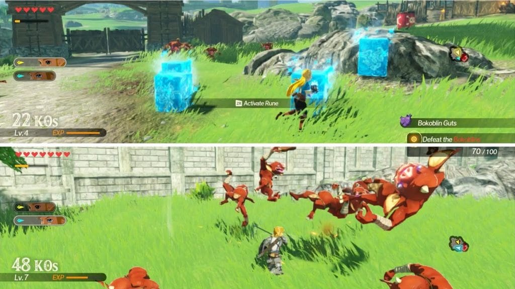 Hyrule warriors: Age of Calamity is speelbaar in ouderwets splitscreen co-op. Door gebruik te maken van de twee Joy-con-controllers van de Nintendo Switch, kunnen twee spelers tegelijkertijd deelnemen aan veldslagen.
