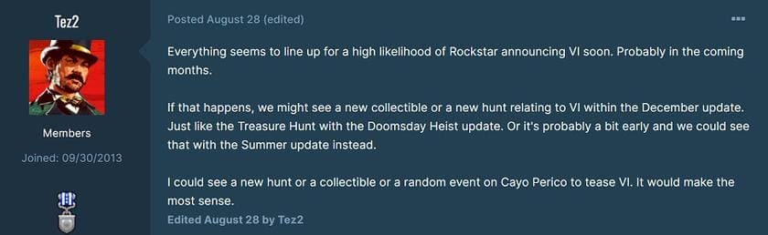 GTA 6 wordt mogelijk ergens in de komende maanden al uit de doeken gedaan met een eerste teaser trailer. Het gerucht komt van Rockstar insider Tez2 die vaak met correcte informatie komt over projecten binnen Rockstar Games. Volgens Tez2 zal de aankondiging van GTA 6 gepaard gaan met een in-game evenement in GTA Online zoals een speciale collectible of een hunt. Tez2 verwacht een update op GTA Online in de maand december 2023, maar afhankelijk van of Rockstar Games, GTA 6 wel of niet gaat teasen, kan het evenement uitgesteld worden naar een later moment. Eerder gaf Tez2 aan dat hij verwacht dat GTA 6 volgend jaar uit gaat komen.