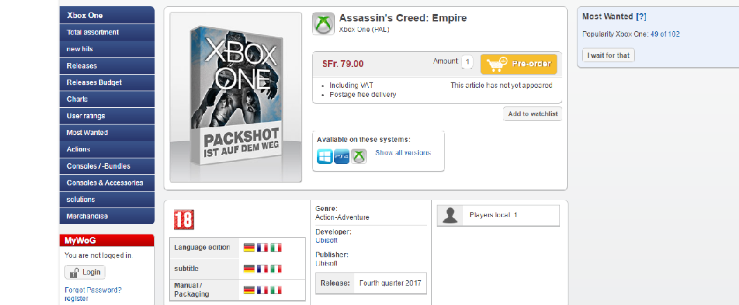 Er gaan nu echter nog meer geruchten de ronde. Enkele maanden geleden dook de naam ‘Assassin’s Creed: Empire’ al eens op. Ook nu verschijnt deze online bij Zwitserse retailer WOG. Het zou niet voor het eerst zijn dat een retailer per ongeluk iets te vroeg lekt.