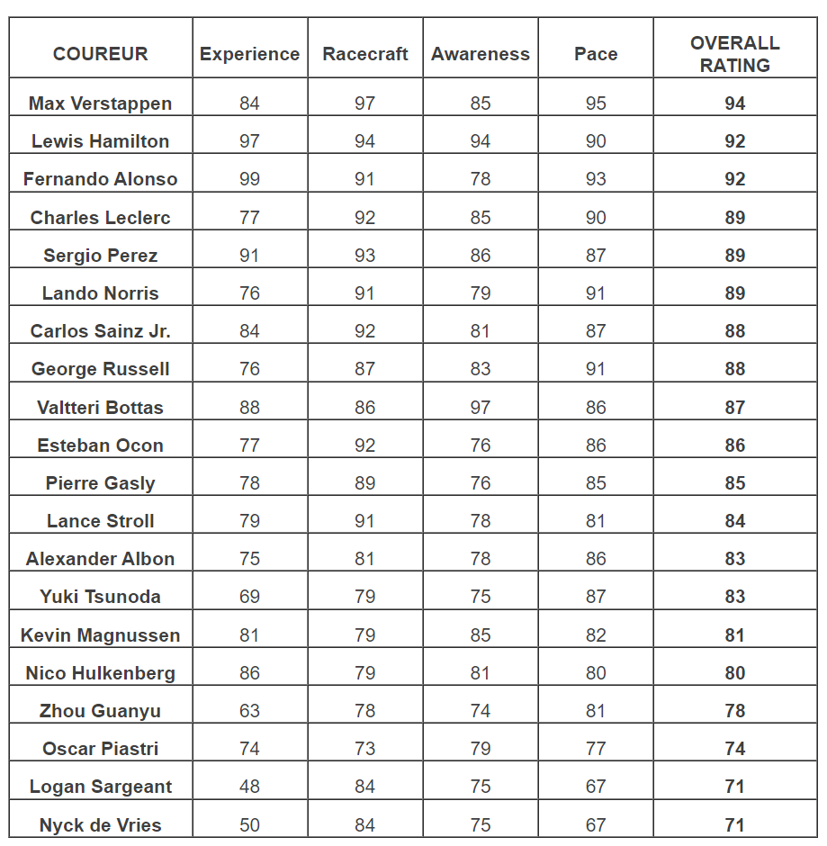 Uitgever Electronic Arts en ontwikkelaar Codemasters hebben de driver ratings bekendgemaakt voor de game F1 23.