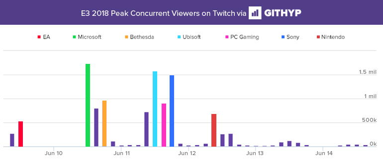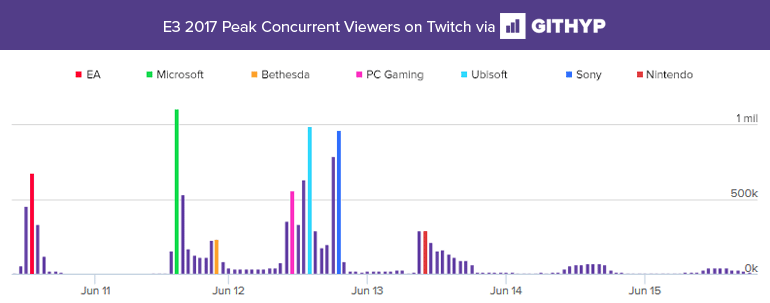 Twitch heeft de cijfers van de zeven presentaties bekendgemaakt met daarnaast de cijfers van vorige jaar. Bij de Xbox-presentatie van Microsoft keken er wel 1.7 miljoen gelijktijdige mensen via Twitch, waardoor het de best bekeken presentatie van dit jaar op Twitch is geworden. Het jaar daarvoor was dat maar 1.1 miljoen gelijktijdige kijkers. Op tweede plaats staat Ubisoft met 1.6 miljoen gelijktijdige kijkers op Twitch en op de derde plek staat Sony met 1.5 miljoen gelijktijdige kijkers.