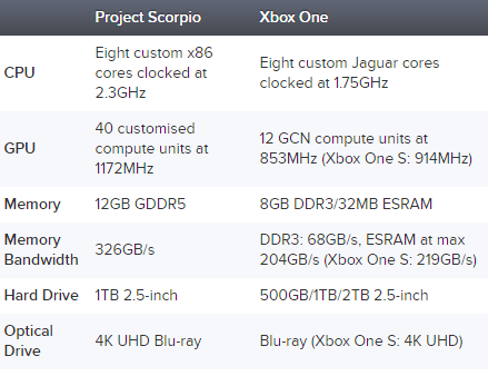 De Xbox Scorpio zal over een week officieel getoond en onthuld worden. We weten al de specificaties van deze 6 teraflops krachtpatser (zie afbeelding hieronder), maar waar we vooral naar benieuwd zijn, is de prijs, de definitieve naam en hoe het eruit ziet. Wordt de krachtigste console bijvoorbeeld ook de grootste console?