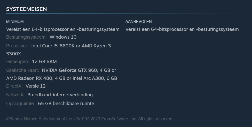 From Software heeft nu op Steam, de minimale systeemeisen bijgewerkt. De aangeraden systeemeisen worden later bekendgemaakt, maar om de game op medium te kunnen draaien, moet je minimaal beschikken over een Nvidia GeForce GTX 960, een AMD Radeon RX 480 of een Intel Arc A380.