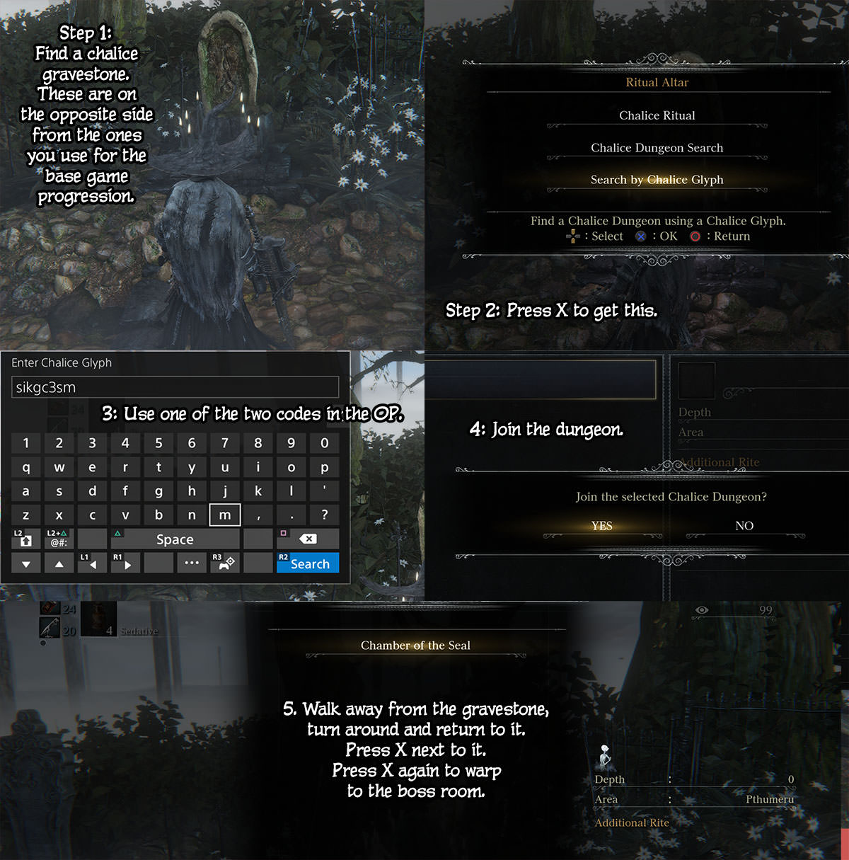 Hieronder zijn er speciale chalice dungeon-codes te vinden waarmee je het op kan nemen tegen onuitgebrachte bazen uit Bloodborne. Deze bazen hebben zoals normale bazen een volledige moveset maar zijn door ontwikkelaar From Software niet gebruikt in de main game. In de gifs hieronder kunnen jullie de twee onuitgebrachte bazen in actie zien. De eerste lijkt een grote wolf/hond en de tweede heeft veel weg van The Moon Presence-baas. Door de onderstaande codes te activeren bij een grafsteen in The Hunters Dream, kunnen ook jullie vechten tegen deze onuitgebrachte bazen. Om weer uit de dungeon te gaan, moet je uit de map vallen.