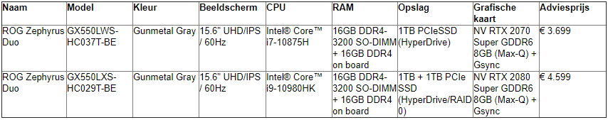 De ROG Zephyrus Duo 15 is nu verkrijgbaar in Nederland en België voor €4.599,-. Dit is de versie met een Intel® Core™ i9-10980HK-processor. Er is ook een andere variant te koop, namelijk een Duo 15 die is uitgerust met een Intel® Core™ i7-10875H CPU. Deze versie is binnenkort verkrijgbaar voor een adviesprijs van €3.699.-.