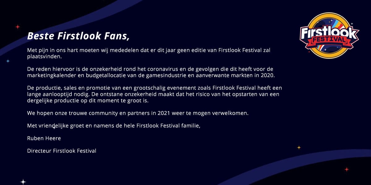 De afgelopen weken werden de Game Developers Conference (GDC) en de de E3 afgelast. Nu geeft Ruben Heere, de directeur van Firstlook Festival aan dat het evenement dit jaar niet doorgaat en dat ze hopen dat alles goed loopt in het jaar 2021. Het is opvallend dat nu al Firstlook Festival 2020 wordt geannuleerd. Het evenement wordt namelijk gehouden in de maand oktober en daarvoor zijn de Gamescom en Tokyo Games Show. Die twee grote shows hebben aangegeven voorlopig door te gaan met de plannen.