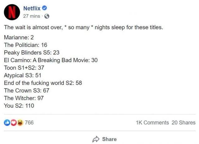 Een definitieve releasedatum hebben we niet gekregen maar vandaag weten we wellicht toch wanneer de eerste aflevering te zien zal zijn. Netflix Nederland heeft vandaag namelijk een Facebook post naar buiten gebracht met het aantal dagen totdat een serie of film te zien is. Bij The Witcher staat 97 dagen en dus is het aannemelijk dat we vanaf 17 december kunnen genieten van The Witcher op Netflix.