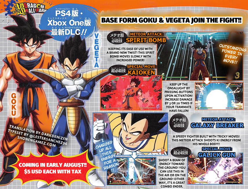Zowel base Goku als base Vegeta zullen in augustus verschijnen als DLC voor Dragon Ball FighterZ. Beide karakters maken onderdeel uit van de season pass maar kunnen ook los aangeschaft worden voor €5 per stuk.