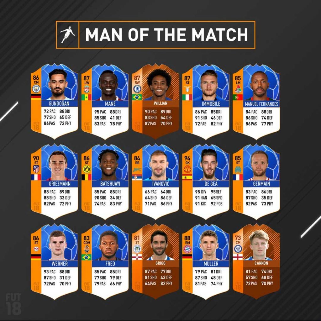 EA Sports heeft weer nieuwe Man of the Match kaarten uitgebracht, ook wel MOTM kaarten genoemd. Deze kaarten zijn beschikbaar in FIFA Ultimate Team 18. Het gaat om spelers die goed gepresteerd hebben in de Champions League, Europa League of de Engelse bekertoernooien. Vele FIFA fans hadden gehoopt op een MOTM kaart van Will Grigg en eindelijk is het zover, Grigg heeft een prachtige upgrade ontvangen en zijn overall rating is nu 81! Een andere mooie MOTM kaart is die van David de Gea. De Gea kreeg deze kaart voor zijn uitstekende wedstrijd tegen Sevilla, waarbij De Gea op zijn MOTM kaart een overall rating van 94 heeft. Een fantastische MOTM kaart die nog niet in dit overzicht staat is de kaart van Vincent Kompany met een rating van 86. Het volledige overzicht is hieronder te vinden: