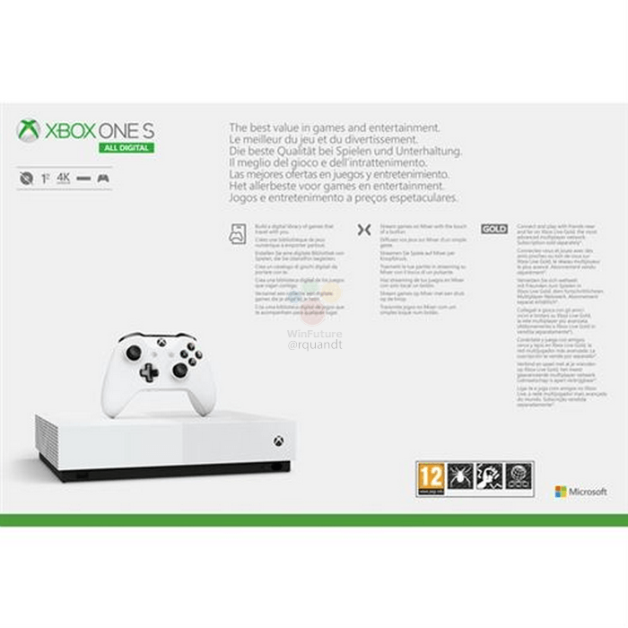 De website WinFuture heeft de onderstaande afbeeldingen waar de doos te zien is, openbaar gemaakt. De nieuwe Xbox One gaat volgens de geruchten Xbox One S All Digital Edition heten en €229,99 kosten. Spelers krijgen in de doos de console, een controller en digitale game codes voor Sea of Thieves, Minecraft en Forza Horizon 3. Volgens WinFuture zal Microsoft de nieuwe console morgen tijdens een nieuwe aflevering van Inside Xbox, officieel onthullen. De Xbox One S All Digital Edition zou op 7 mei 2019 in de winkels moeten liggen.