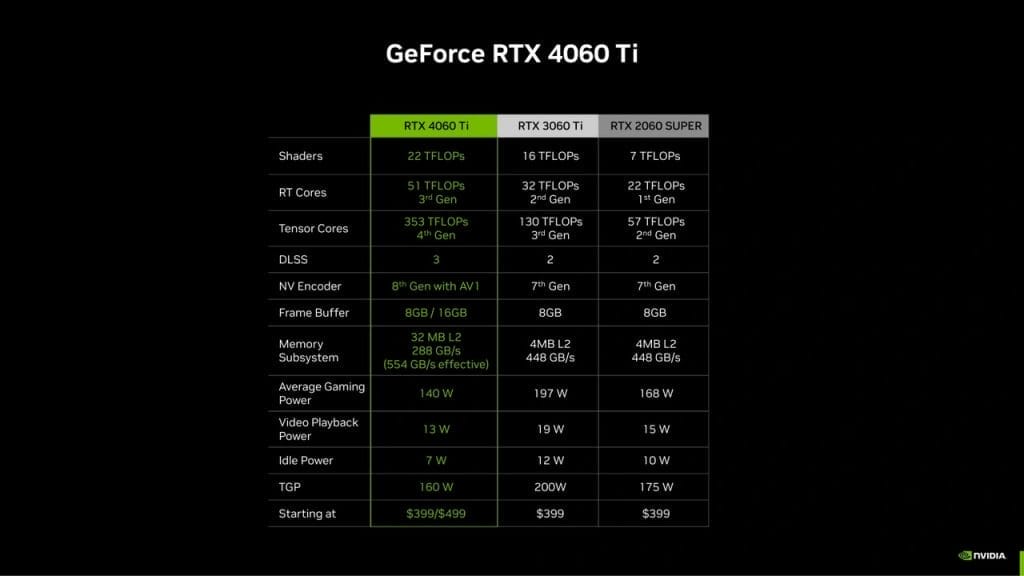 De RTX 4060 Ti heeft een AD106-gpu met 4352 CUDA-cores en 32MB L2-cache. Volgens Nvidia heeft de videokaart een totale rekenkracht van 22 Teraflops. De kaart draait op 160W maar Nvidia claimt dat het 140W gebruikt bij het spelen van games. Beide kaarten ondersteunen verder DLSS 3.0.