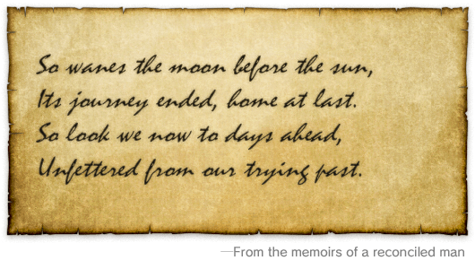 Na de dageraad van wedergeboorte te hebben verwelkomd, naar de azuurblauwe hemel te zijn gebracht, een land met karmozijnrode vlekken te hebben bevrijd, de duisternis in een door licht overstroomde wereld te hebben hersteld, en nu staande met de afnemende maan in hun rug, zetten onze avonturiers hun zinnen op een nieuw begin. Nou, dat is mijn mening over de woorden, hoe dan ook…