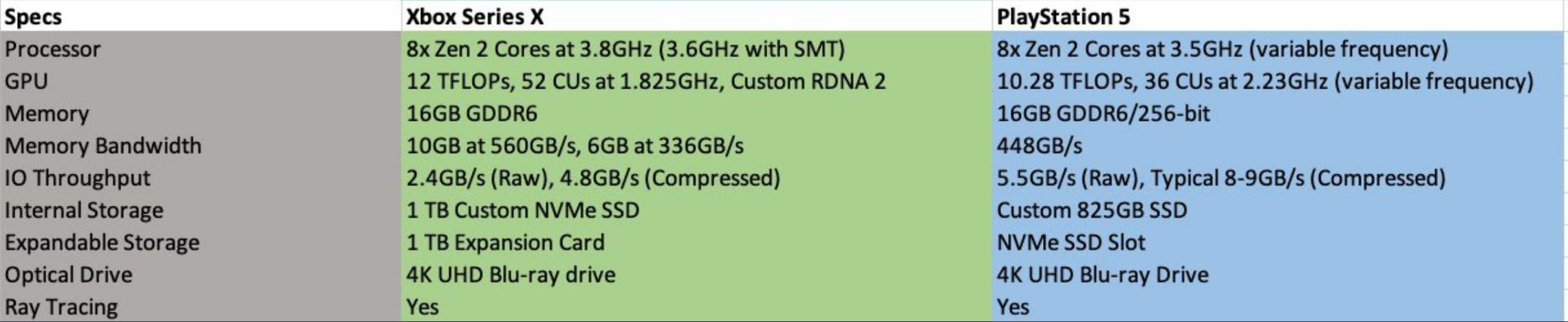 Beide next-gen consoles hebben een custom CPU en GPU van fabrikant AMD. De CPU en GPU van de Xbox Series X hebben wel meer CU’s en draaien op iets hogere clocksnelheden. Daardoor komt de Xbox Series X op 12 Teraflops aan totale rekenkracht, terwijl de PlayStation 5 blijft op 10.28 Teraflops.