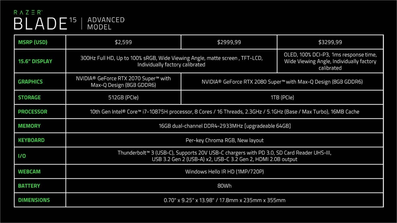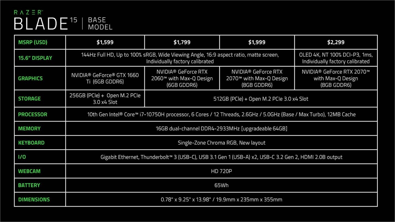 De prijzen van de 2020 versies van de Razer Blade 15 samen met de volledige specificaties zijn in de afbeeldingen hieronder te vinden.