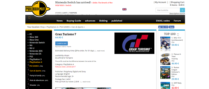 Een Finse webwinkel genaamd Puolenkuun Pelit heeft mogelijk de releasedatum van Gran Turismo Sport (ook wel Gran Turismo 7 genoemd) gelekt. De site geeft als releasedatum 20 april, dat is dus over een maandje. De game komt dus vrij snel uit als we de Finse retailer mogen geloven. Er is nu een closed bèta aan de gang van Gran Turismo Sport en de releasedatum lijkt ons aannemelijk want ontwikkelaars kiezen er de laatste tijd steeds vaker voor om vlak voor de release van een game een bèta te houden. Denken jullie dat de game daadwerkelijk op 20 april uit zal komen? Laat het weten in de comments.