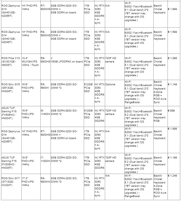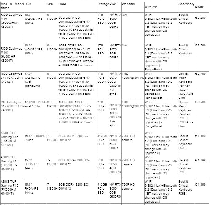 Alle 2021-modellen laptops van ROG waren tot nu toe uitgerust met AMD Ryzen-processoren. De lenteline-up bestaat uit nieuwe modellen die beschikken over Intel CPU’s. Het gaat om de volgende modellen: