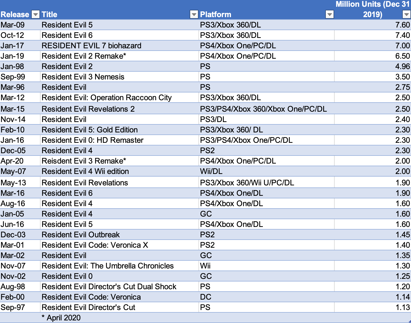 Capcom deelt ook alle huidige verkoopcijfers van alle Resident Evil-games. Resident Evil 7 heeft nu 7 miljoen verkochte exemplaren bereikt. Op nummer één staat Resident Evil 4 met 7.6 miljoen verkochte exemplaren, maar eigenlijk is dat Resident Evil 4 want die heeft meerdere remasters op meerdere platforms gekregen. In de lijst hieronder staat niet het totaal maar de verkopen per versie. In totaal heeft de gehele Resident Evil-franchise 95 miljoen verkochte exemplaren weten te bereiken.