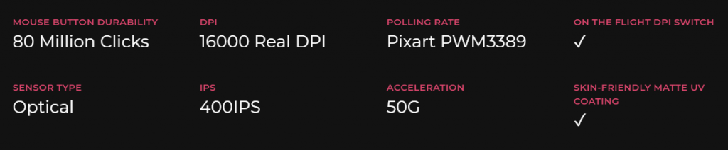 De AOC AGM600 bevat een Pixart PMW3389 sensor met een maximale DPI van 16.000. Dit is best hoog en meer dan genoeg voor de meeste gamers. Wel zijn er gaming muizen op de markt die de 25.000 DPI aantikken. De muis heeft 50g versnelling en een polling rate van 1,000 Hz. De switches zijn van het type mechanical Kailh. Deze gaan 80 miljoen kliks mee, wat goed is. De meeste gaming muizen beloven een duur van 50 miljoen kliks. De switches hebben een fijne klik met een hoge activeringssnelheid.