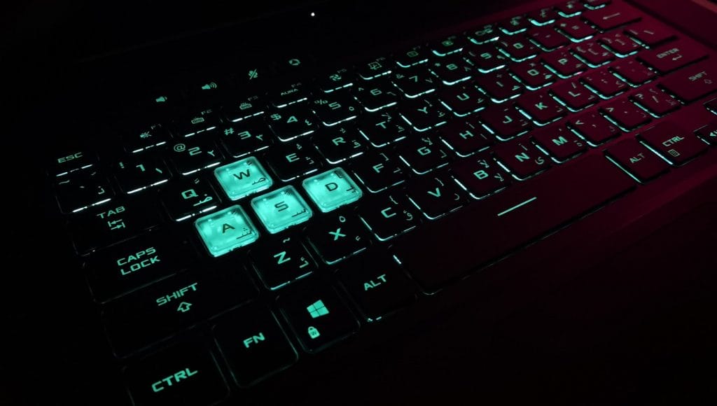 Het toetsenbord van de ASUS TUF Dash F15 typt heel lekker met een goede travel feedback per klik. Het is één geheel met genoeg ruimte tussen de toetsen zonder numpad. De WSAD-knoppen hebben een doorzichtig ontwerp. Linksboven heeft ASUS vier extra knoppen. Twee voor het volume, een knop voor muten van je microfoon en als laatste kan je met een druk direct de Armoury Crate-software openen.