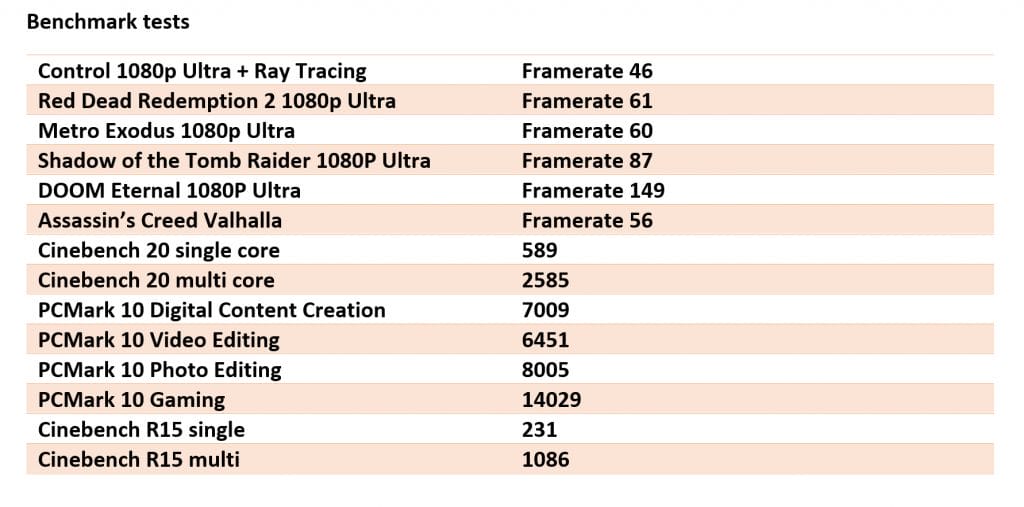 De TUF Dash F15 is een krachtige laptop, zoals hieronder in de benchmark-resultaten is te zien. Wel is het belangrijk om te weten dat de verschillen met andere laptops die ook deze videokaart hebben, sterk kan verschillen. De Total Graphics Power (TGP) van de GPU is namelijk van cruciaal belang voor performance. Er zijn RTX 3070’s die tot 130w kunnen. Deze laptop is geconfigureerd voor maximaal 85w. En dat merkten we wel degelijk tijdens het gamen. De ROG Strix G17 die we laatst hadden, beschikte ook over een RTX 3070, maar die behaalde met 115w duidelijke hogere framerates.