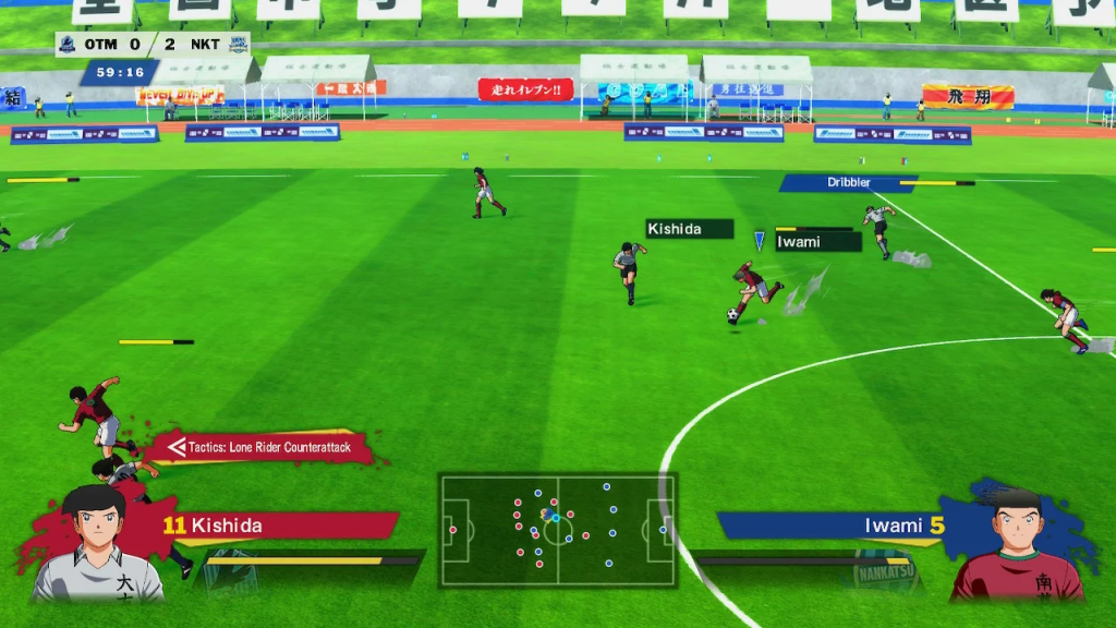 Verder is er een meter onderin het scherm, dit is de skills meter. Wanneer deze vol is, kan je een gezamenlijke boost voor je team geven of je kan je keeper deze boost geven zodat hij gegarandeerd een superschot kan stoppen. De belangrijkste vraag is of deze game gebalanceerd of een button mash-game is. Captan Tsubasa is zeker goed gebalanceerd. Je moet het dribbelen goed onder de knie krijgen, en je kan niet roekeloos schieten of tackelen, want dan maak je fouten die kunnen worden afgestraft.