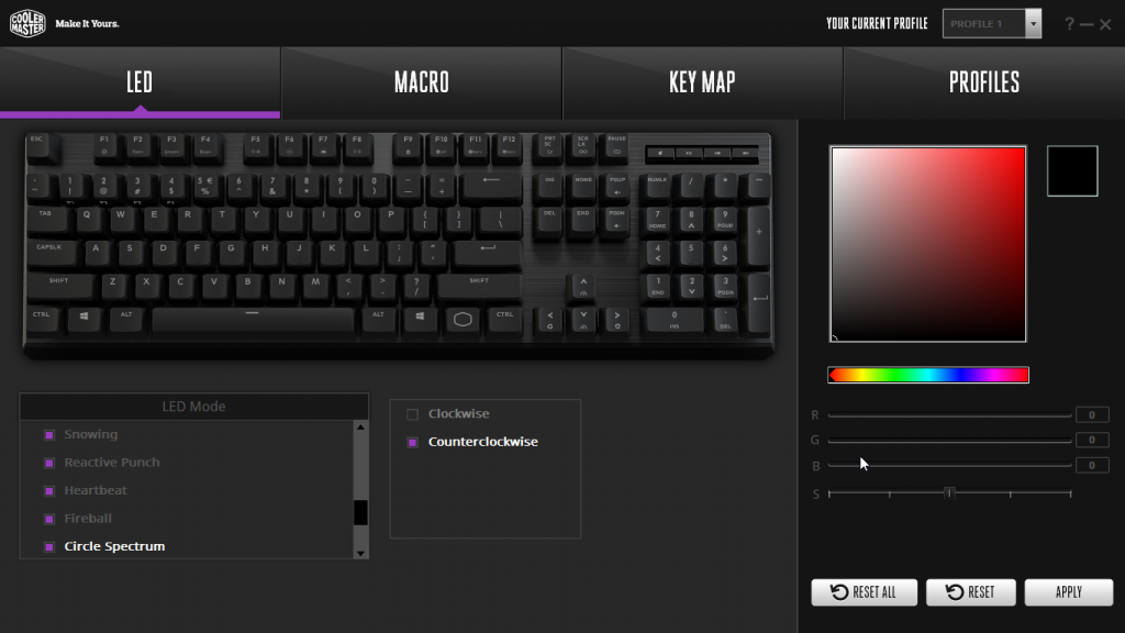 In plaats van alle toetscombinaties uit je hoofd te leren kan je ook gewoon de officiële software gebruiken. De Cooler Master Portal-software laat je de LED-verlichting naar wens instellen. Je kan individuele kleuren kiezen, speciale effecten doen zoals een regenboog of zelf een kleuren equalizer die reageert op het geluid van je systeem. Verder zijn er aparte macro’s, key mappings en profielen in te stellen.