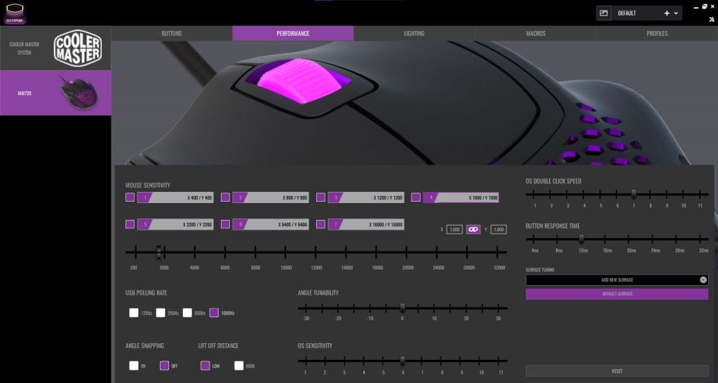 Voor de mensen die alles tot in de puntjes precies willen instellen, heeft Cooler Master ook geavanceerde opties. Zo kan je de USB polling rate, de lift off distance, dubbelklik snelheid, responstijd van knoppen, surface tuning en meer naar wens aanpassen. Al deze features zijn in één overzicht te vinden in de applicatie en dus hoef je niet te zoeken, wat het gebruikersvriendelijk maakt.
