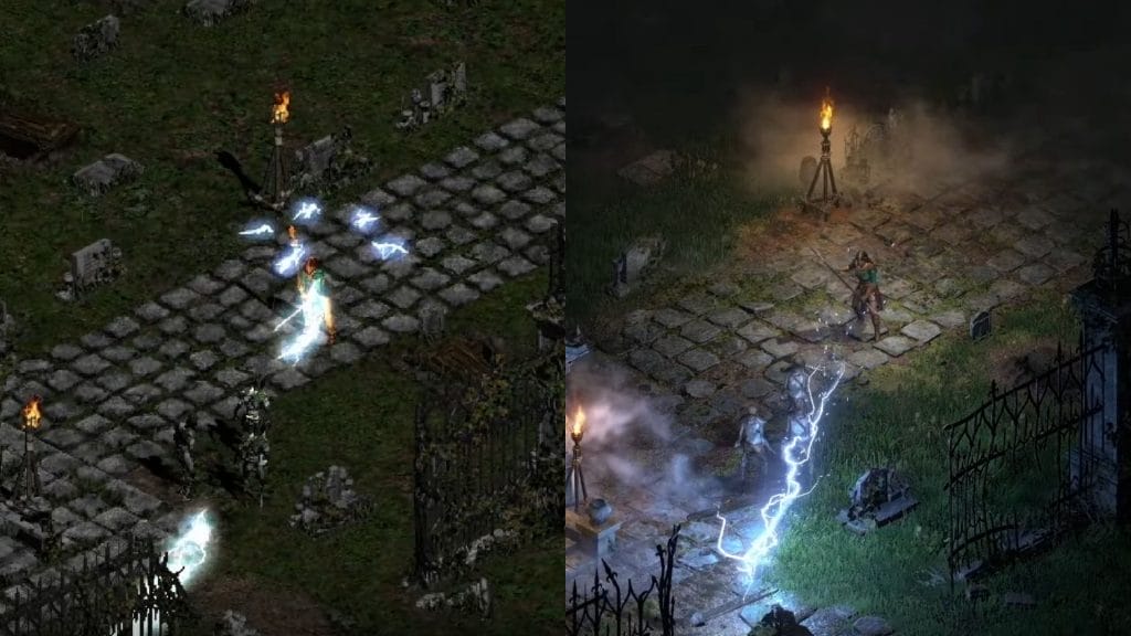 Het eerste wat opvalt wanneer je deze game opstart, is dat er een enorme sprong in grafische kwaliteit is. Vicarious Visions had zich al bewezen met de remakes van Crash Bandicoot 1, 2 en 3, maar een game als Diablo opnieuw maken is veel complexer dan een platformer. Spelers kunnen tijdens het spelen naadloos wisselen tussen klassieke graphics met 2D sprites of de moderne 3D weergave. Het ziet er heel goed en gedetailleerd uit, en ondanks dat er nu veel meer kleuren en effecten zijn dan 20 jaar geleden, is de grauwe en donkere sfeer van het origineel behouden. Toen de originele Diablo II verscheen, moest je veel van de wereld verbeelden. Nu is dat helemaal niet nodig aangezien alles haarscherp oogt. De belichting maakt verder indruk, lichteffecten van vuur en elektriciteit zien er met name in de donkere omgevingen geweldig uit. Magische spreuken verhelderen heel kort de omgeving. Alleen al door de visuele effecten was het voor ons duidelijk, onze eerste personage moest een Sorceress zijn.