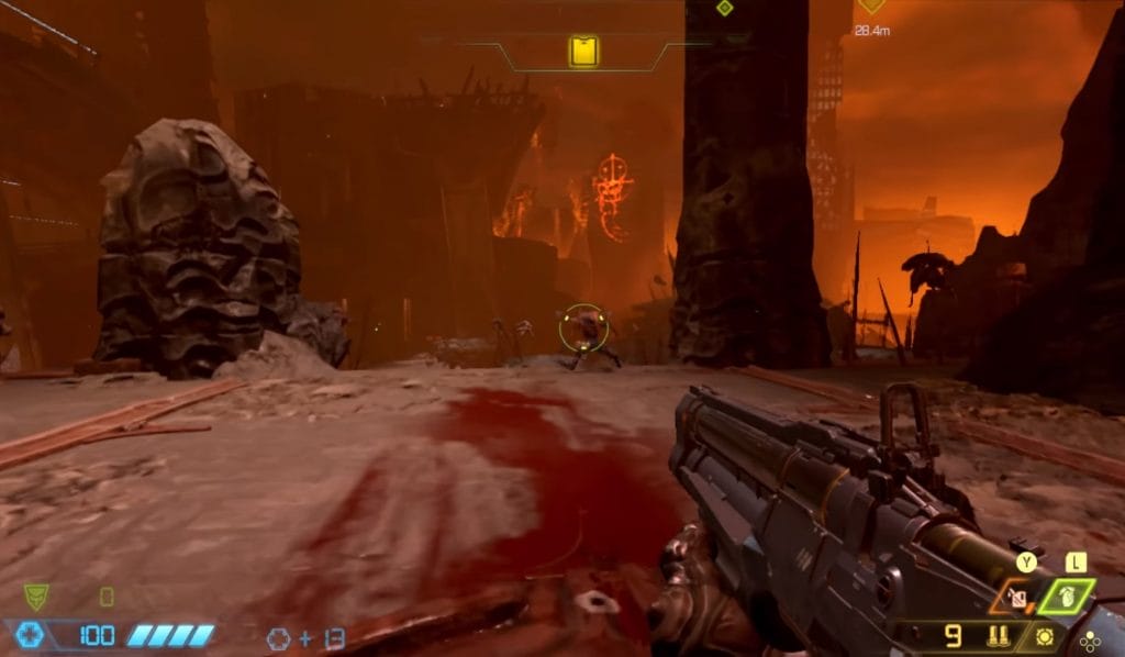 Al vanaf het eerste minuut zie je dat de game niet zo scherp oogt op de Nintendo Switch dan alle andere platforms. Vooral als je stilstaat, ziet de wereld, wapens en alle karakters er niet mooi uit. Het interessante is dat je bij DOOM Eternal nauwelijks de tijd hebt om stil te staan. Wanneer je beweegt, schiet, zaagt en glory kills doet, oogt de game niet zo lelijk. Wanneer de game in ‘motion’ is, is de game opvallend genoeg wel prima te doen.