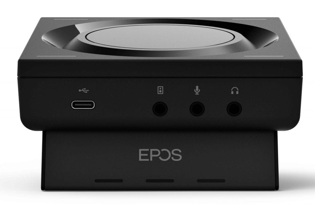 De EPOS GSX 1000 2nd Edition is kwa uitstraling ietsje anders dan de voorgaande GSX 1000. De dimensies zijn niet aangepast namelijk 150 x 70 x 145 mm. Achterin is er nu een USB-C-poort in plaats van MicroUSB. Aan de achterkant zijn er verder aansluitingen voor speakers, microfoon en headset.