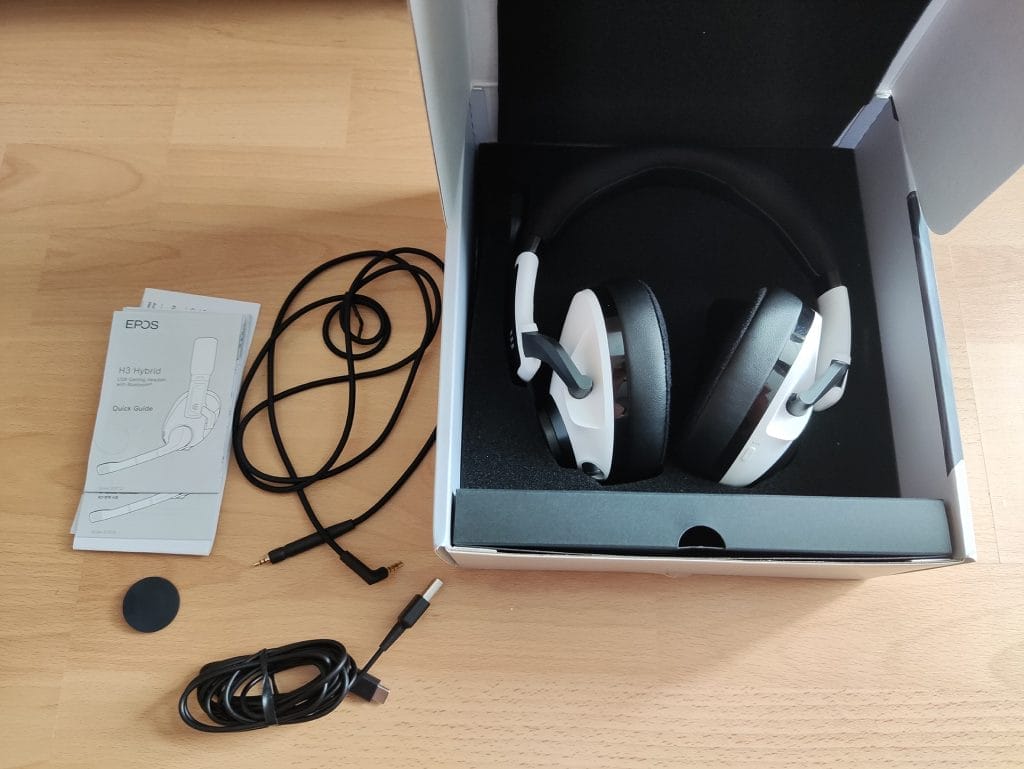 EPOS weet dat een premium unboxing-ervaring, meteen een goede eerste indruk achterlaat. Dat zit bij de EPOS H3 Hybrid ook helemaal goed. Wanneer je de doos opent zie je direct de headset schitteren. Onderin, is er een kleinere doos te vinden. Deze bevat een 3.5mm audiokabel (1.5 meter) gemaakt van zwarte decoratiestof, een USB-C-kabel (2 meter), een klepje waar we later meer over gaan vertellen en de nodige handleidingen.