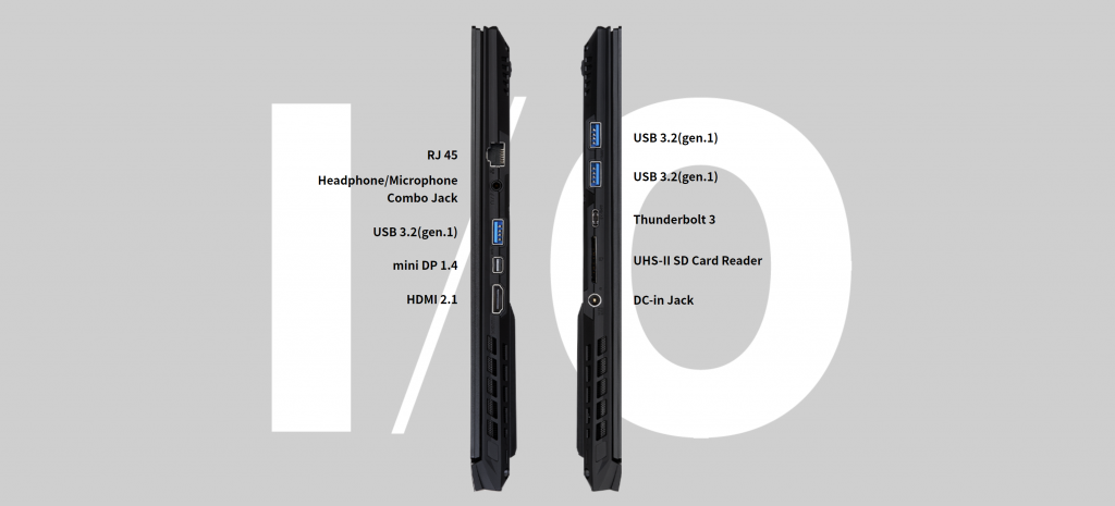 Aan de linkerkant van de laptop is er nog één USB Type-A 3.2, een Mini DisplayPort 1.4, een HDMI 2.0, een ethernetaansluiting en een 3.5mm headphone jack te vinden. Met name de HDMI-aansluiting heeft ons weten te verrassen. De meeste laptops van 2021 hebben allemaal HDMI 2.0, maar de AERO 15 van Gigabyte bevat wel de nieuwe HDMI 2.1. Hiermee is er meer bandbreedte mogelijk en kan je gamen op een 4K 120FPS tv of monitor.