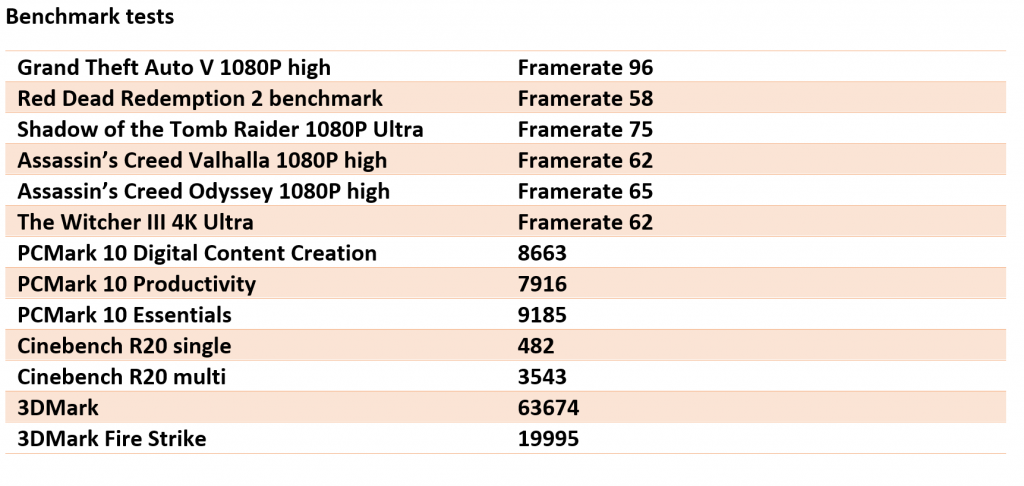 De AERO 15 is zeker een krachtige laptop zoals hieronder is te zien in de benchmark-resultaten. De 105w RTX 3070 met 8GB videogeheugen doet zeer goed werk, vooral als je bedenkt dat dit een 4K-systeem is. Nieuwe features zoals Ray Tracing, Dynamic Boost 2.0 en DLSS worden ondersteund. Met name DLSS is zeer handig bij deze laptop. Hiermee zou je vrijwel alle moderne games op een hoge framerate moeten spelen.