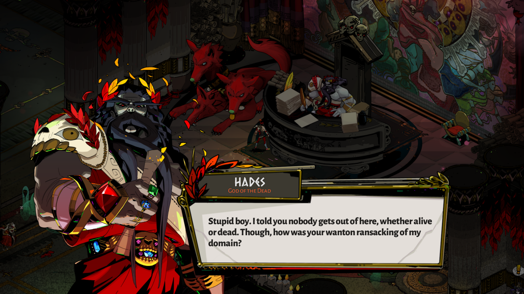 Tijdens runs, kom je steeds meer te weten over het verhaal van Hades. Dit doe je door conversaties te voeren met de zeer memorabele personages uit de onderwereld. Hoofdpersoon Zagreus praat ook regelmatig met zichzelf waar jij de speler, steeds meer informatie krijgt over hem en het leven in de onderwereld.