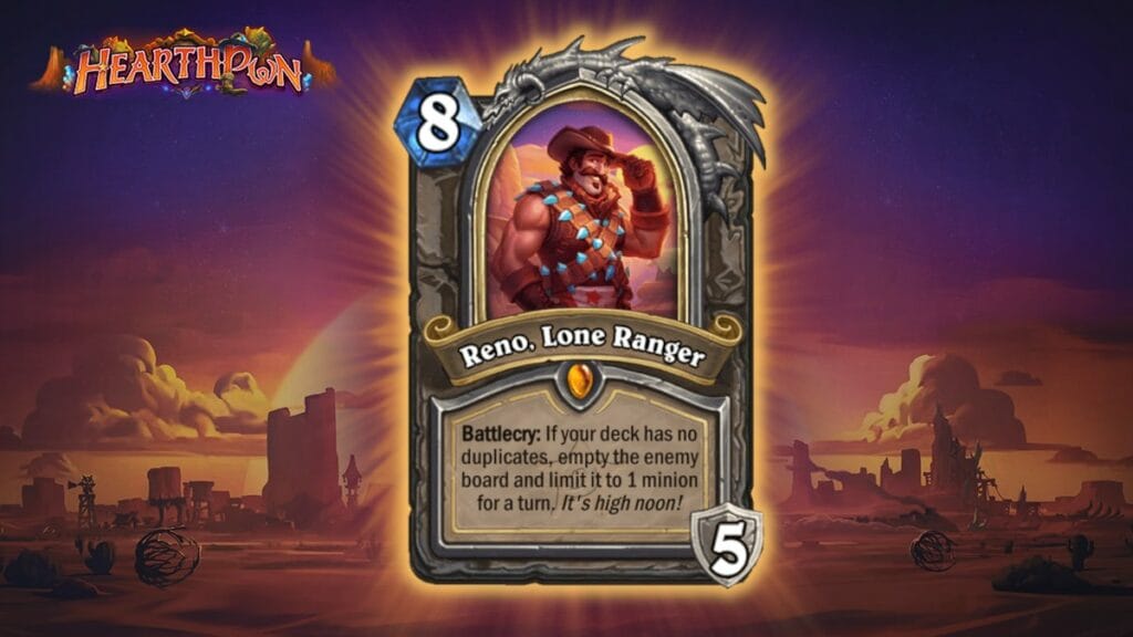 Een andere opmerkelijke kaart is Reno. Lone Ranger. Dit is de enige Hero-kaart van deze uitbreiding en het is een Neutral-kaart. Dat houdt in dat alle 11 classes Reno kunnen gebruiken. Wat Reno zo speciaal maakt is niet dat het je Hero overneemt, maar zijn effect op een duel. Als je deck geen dubbele kaarten heeft, veegt Reno het bord schoon. Dat is niet alles, want de eerstvolgende beurt, kan je tegenstander maar één minion inzetten. Een ouderwets Cowboy showdown als het ware. Met Reno kan je een strategie van je tegenstander behoorlijk verpesten.