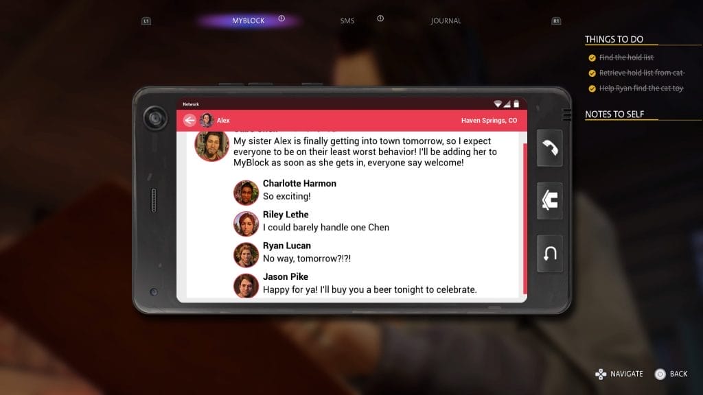 Wat ook leuk is om te doen, is door je telefoon bladeren. Net als het dagboek is de telefoon een hele leuke toevoeging aan de game. Je ziet op je telefoon al je contacten en alle berichten die erbij horen. Verder kan je algemene tweets zien van mensen die in het dorp wonen, wat ervoor zorgt dat je ook informatie krijgt van mensen die geen interactie met Alex hebben.