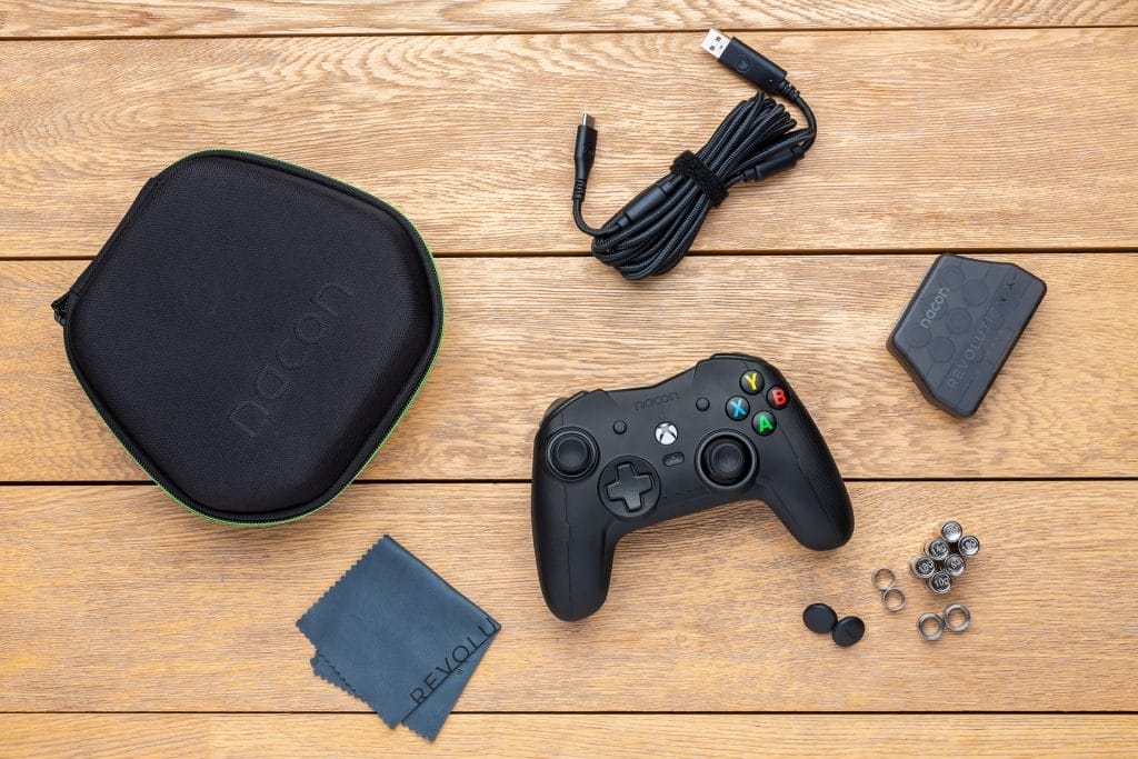 In de doos van de Nacon Revolution X Pro krijgt je uiteraard de controller. Verder is er een 3 meter lange USB-kabel, bekleed met decoratiestof. Dit zorgt ervoor dat de kabel niet in de knoop gaat. Verder is er een case te vinden waar je de controller in kan doen om bijvoorbeeld mee te nemen naar een eSports-toernooi. De case is groot genoeg om alle onderdelen van de controller in te doen, en het is stevig aan de buitenkant. Dit zorgt voor optimale bescherming, want de harde buitenkant zorgt ervoor dat er geen druk komt op de controller zelf.