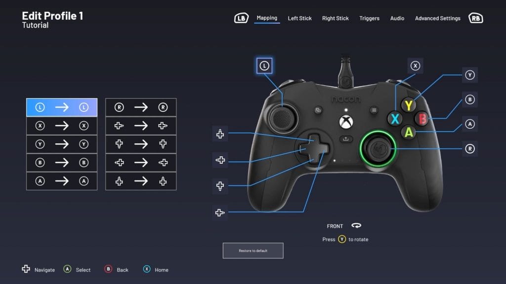 Het instellen van profielen gaat via de officiële Nacon PC applicatie. Het is ook mogelijk om profielen te downloaden via de Nacon website, als je zelf niet aan de zeer uitgebreide instellingen wil zitten. De bestanden op de website zijn geüpload door andere spelers. Voor vrijwel iedere multiplayer-game zijn er wel profielen te vinden op de website. Je download zo’n profiel en zet het via de Nacon-applicatie over naar je controller. In de software kan je verder de RGB-verlichting van de controller aanpassen en is het mogelijk om je controller te voorzien van nieuwe updates.