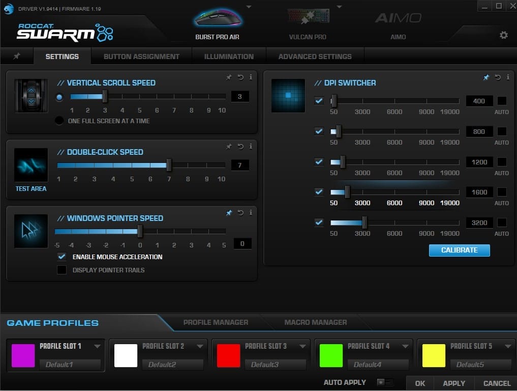 Om de Roccat Burst Pro Air geheel naar wens in te stellen moet je gebruikmaken van de gratis Roccat Swarm software. De software oogt niet heel modern, maar bevat wel heel veel instellingen en cusomization-opties. Helaas is niet duidelijk wat iedere feature precies doet, een korte uitleg per onderdeel was handig geweest. Gebruikers kunnen maximaal 5 aparte profielen instellen voor de muis. Zo kan je bijvoorbeeld een profiel instellen voor een shooter en een profiel voor een MMO.