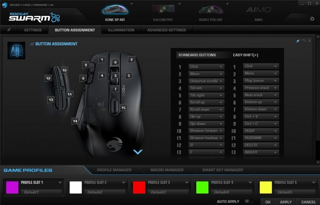 Via de officiële Roccat Swarm Software, kunnen gebruikers de Kone XP Air geheel naar wens instellen. De software oogt niet modern en is niet heel gebruikersvriendelijk. Wij hebben toegankelijkere software gezien bij andere gaming muizen. Wat betreft features bevat de software wel heel veel mogelijkheden. Zo kunnen gebruikers 5 verschillende profielen opslaan op de muis en met een druk op de knop kan er gewisseld worden naar een ander profiel. Bijvoorbeeld een profiel voor shooters en een profiel voor RPG’s.