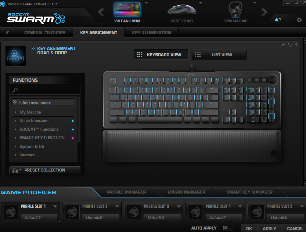 Roccat Swarm geeft gebruikers toegang tot geavanceerde functies zoals 5 aparte profielen die op het toetsenbord zelf worden opgeslagen. Dit is heel handig, want als je het toetsenbord aansluit op een andere PC of laptop, dan neem je al je instellingen mee. Per profiel zijn er behoorlijk veel instellingen aan te passen zoals de RGB-effecten, de snelheid van de verlichting, de vertraging tijdens het indrukken van een toets, het geluid van een klik, macro’s, de mediaknoppen en meer. Het toetsenbord ondersteund Easyshift. Dit is een functie waarbij je iedere toets als het ware een tweede functie kan geven. Per key kan je zelf functies toewijzen via de Swarm Software.
