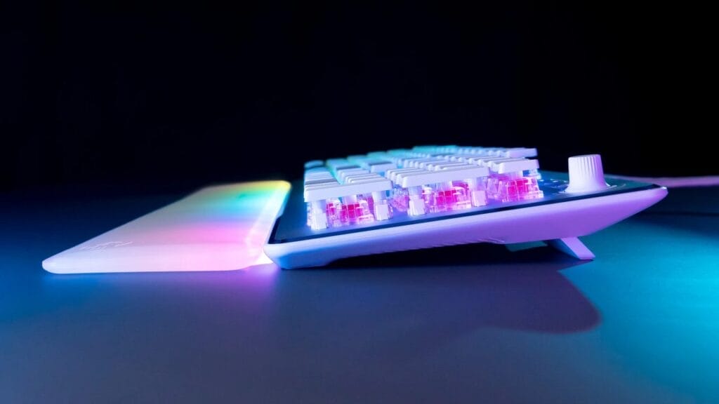 De bovenstaande is niet alle RGB op dit toetsenbord, want aan de onderkant waar de palmsteun kan worden gekoppeld, is er ook verlichting. Zonder palmsteun gekoppeld, krijg je op je bureau een cool glow effect, denk aan Philips Ambilight. Als je de palmsteun wel aansluit, krijg je veel meer licht te zien, want de palmsteun is transparant. Licht schijnt erdoorheen waardoor het geheel tot leven komt. Een leuke feature van nieuwe Roccat-producten is dat er ondersteuning is voor AIMO-technologie. Indien je beschikt over meerdere Roccat peripherals zoals een muis of headset, dan kan je de RGB-verlichting synchroon laten lopen.