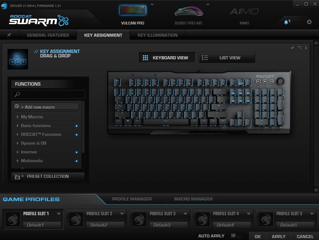 Om de Roccat Vulcan Pro tot in de kleinste details aan te passen is de gratis Roccat Swarm software nodig. De Swarm software geeft gebruikers de mogelijkheid om vijf aparte profielen in te stellen voor de Vulcan Pro. Deze worden op het toetsenbord opgeslagen waardoor je de profielen ook kan gebruiken als je het toetsenbord bijvoorbeeld aansluit op een andere PC. Gebruikers kunnen per profiel functies instellen voor bepaalde toetsen. Verder krijgen gebruikers de mogelijkheid om de RGB-verlichting, de snelheid van de verlichting, de vertraging van het indrukken van een key, het geluid van iedere klik, profielen en macro’s aan te passen. Het toetsenbord heeft ondersteuning voor Roccat’s EasyShift-functie. Dit is als het ware een tweede FN-functie die je per key kan toewijzen via de software.