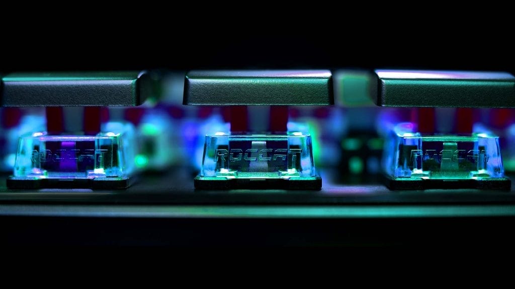 Gamers houden van RGB-verlichting en de Roccat Vulkan Pro stelt hier niet teleur. Door het design van de Roccat Vulcan Pro voelt de RGB-verlichting anders aan dan toetsenborden van concurrenten. Licht schijnt niet direct door een keycap, maar ook eromheen. De helderheid is behoorlijk hoog waardoor iedere toets als het ware 360 graden verlicht wordt. Met name in donkere omgevingen ziet dit er prachtig uit.
