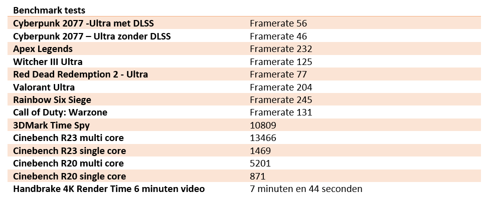 De tabel hieronder laat zien dat op Cyberpunk 2077 na, alles boven de 60 frames per seconde komt. Alle shooters draaien makkelijk boven de 120 frames per seconden. Een zware game zoals Red Dead Redemption 2 op max settings draait op een gemiddelde framerate van 77. Voor zulke prestaties betaalde je nog maar een jaartje gelden meer dan €3000 voor. Deze laptop presteert in enkele gevallen beter dan duurdere laptops die beschikken over een RTX 3080, maar die bijvoorbeeld draaien op 80 of 100W. Als je een laptop gaat kopen, kijk dan goed naar hoeveel watt de videokaart gebruikt.