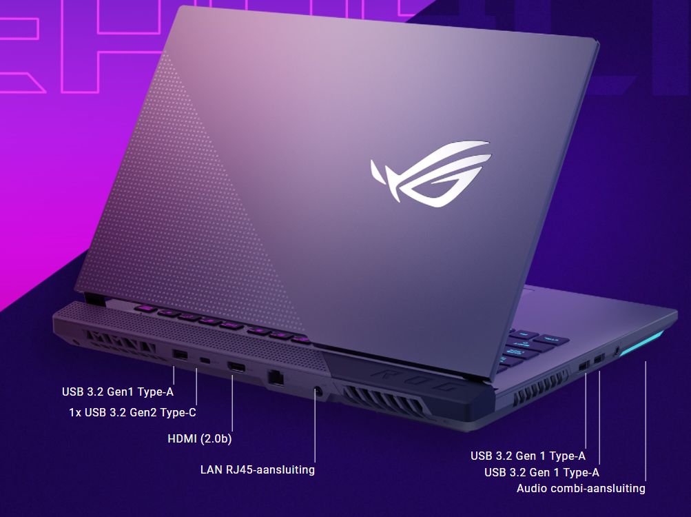 Opvallend is dat de ROG Strix G17 aan de rechterkant helemaal geen aansluitingen heeft. Alle aansluitingen zijn aan de linker of achterkant te vinden. Aan de achterkant is er een USB 3.2 Type-A, een USB 3.2 Type-C (handig voor het aansluiten van een powerbank), een connector voor de oplader, een netwerkaansluiting en een HDMI-poortje te vinden. Laatstgenoemde valt tegen want het is helaas niet HDMI 2.1. Hierdoor kan je met deze laptop niet op 4K 120fps spelen wanneer je het aansluit op een 4K tv. Alleen gamen op 4K-resolutie op een framerate van 60 is mogelijk met HDMI 2.0b.