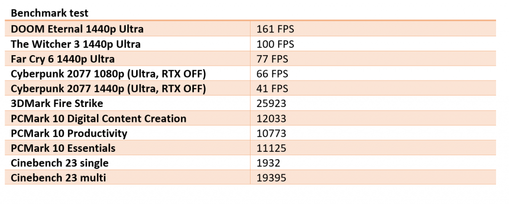 Dit model is uitgerust met een Nvidia GeForce RTX 3070 Ti. Er is ook een mogelijkheid om deze laptop te kopen met een 3080 Ti. De maximale TDP is hier verhoogd met 20W. Afgelopen jaar kon de videokaart van de SCAR 17 met Turbo Boost ingeschakeld maximaal draaien op 130W. Dit jaar is dat maximaal 150W. Extra stroom zorgt voor net wat meer frames per game. De tabel hieronder laat zien dat zelfs de meest recente open wereld games op Ultra settings, uitstekend te spelen zijn. Om volledig te genieten van de maximale framerate van het 240Hz-scherm, is 1080p met DLSS ingeschakeld de beste optie.